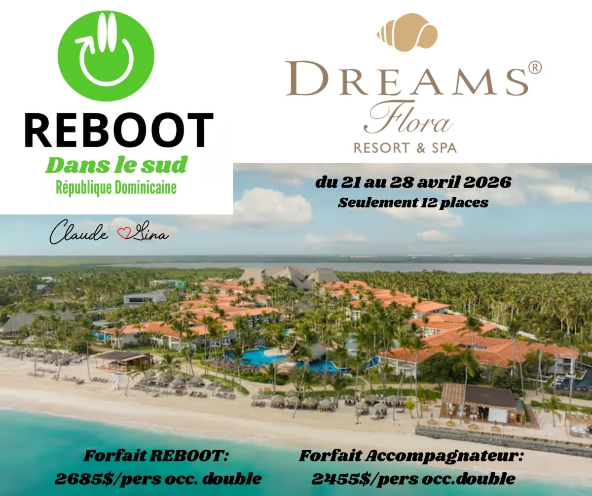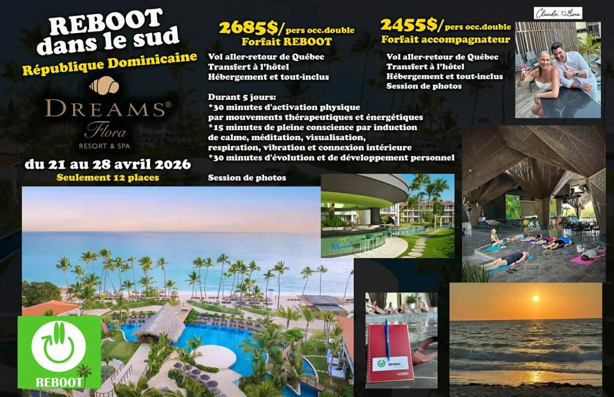 REBOOT dans le sud se veut également une occasion à te retrouver, te reconnecter avec tout ton être, ta vie/ton pourquoi et ceux qui t'entoure pour enfin te permettre d'actualiser ton plein potentiel et de gouter au bonheur et au mieux-être au jour le jour!